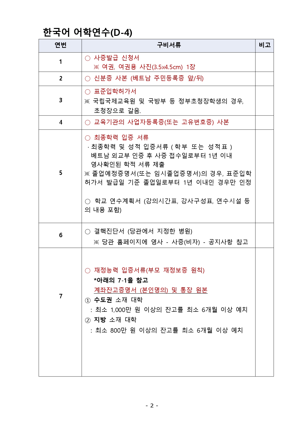 베트남 서류 (신청인) | 1 | 여권 (6개월 이상 남음) 사증발급 신청서 흰색바탕 사진 (최근6개월) | 여권의 유효 기간은 6개월 이상 남음 |